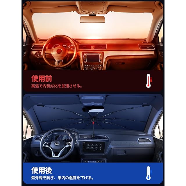 【5層高分子断熱材料・99.9%以上UVカット】夏には、紫外線を防ぎ、車内の温度を下げることを目指します。フロントサンシェードの傘面は6層ナノ高分子断熱材料を採用し、外側はチタンシルバーコーティングで、強い日差しを反射して車内温度の上昇を抑え、約99%以上の紫外線を効果的に遮断しますので、外気温が上昇しても、駐車中の車内を涼しく保ち、ひどい暑さを防げます。蒸し暑い車の環境に悩まされることはなくなります。 内装劣化防止、ダメージや経年劣化を防ぎます。駐車時の大事な車を太陽光による損傷やハンドル焼け、ダッシュボードなどの樹脂部分の日焼けからしっかりご愛車を守ります。駐車の度に気持ちをより涼しくしてくれます。