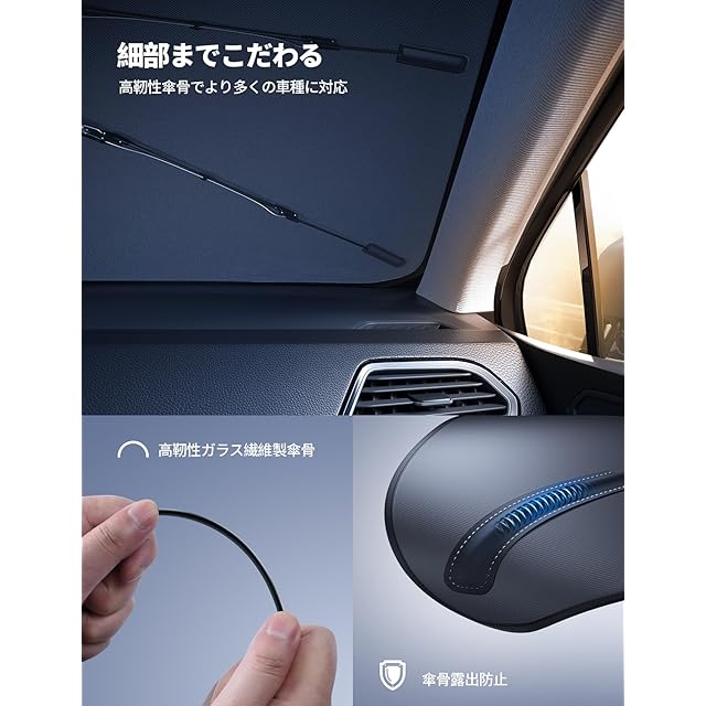【傘骨露出防止・頑丈なガラス繊維製傘骨】各傘骨の末端に露出防止のデザインにより、車の内装に傷つける心配はありません。傘骨は強さ、耐熱性、耐食性のバランスが完璧なガラス繊維が採用され、耐用性が優れます。