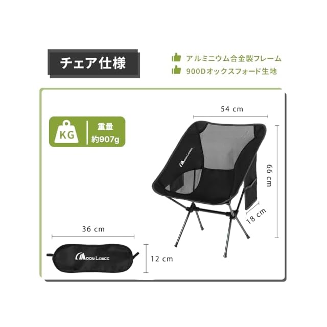 【優れた耐久性&通気性のキャンプ椅子】 フレームには高強度アルミ合金、シートには900Dオックスフォード+メッシュ生地を使用。耐荷重150kgで、大人も安心して使えます。通気性抜群で夏場も快適!