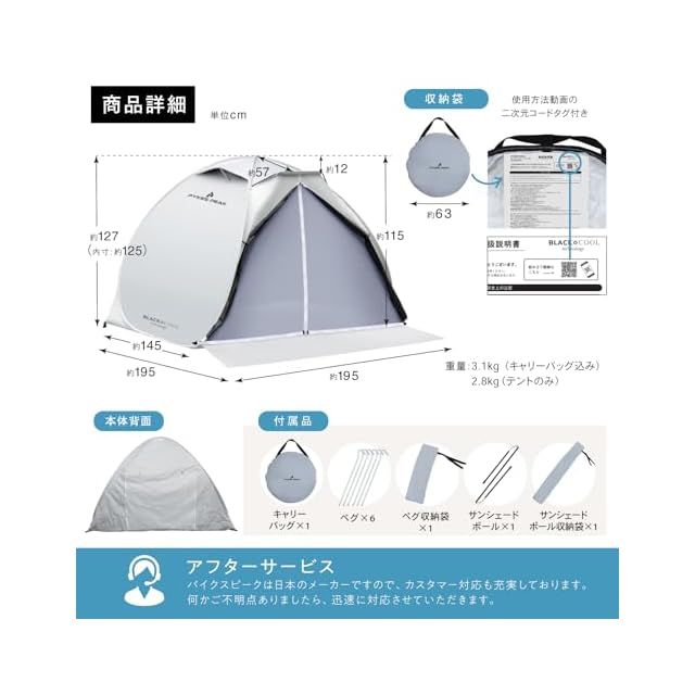 【テントの使用方法をオリジナル動画でサポート!】 PYKES PEAKでは、ビギナーからベテランの方まで本製品を快適にご使用いただけるように、「組み立て方と収納方法の説明動画(日本語)」をご用意しています。 説明書のQRコードからWebサイトにアクセスし、動画のリンクをクリックでアクセス可能です。 ポップアップテントの開き方から設営方法、たたみ方をお好きな時にスマートフォンなどからご覧いただけますので、ぜひお役立てください!※キャンプにでかける前に、取扱説明書通りに付属品がセットされているかを確認し、必ず一度組み立ててください。まれに縫製上の不備やセットミスなどにより、設営ができない場合があります。