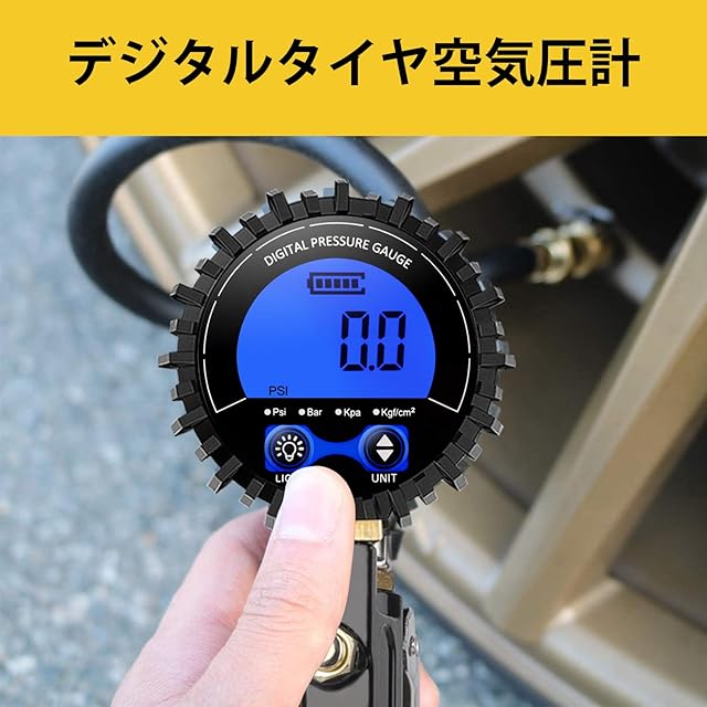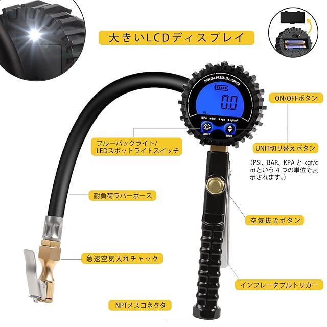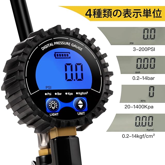 1.【読みやすい表示】:バックライト付きのLCDデジタル表示なので、計測したタイヤ空気圧が読みやすいです。背面補助ライトがあるため、暗いところでも操作しやすいです。