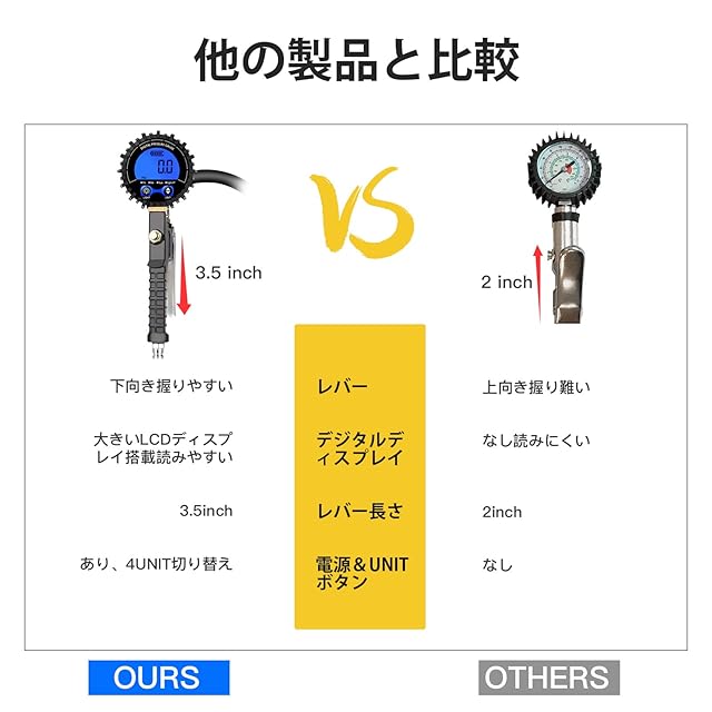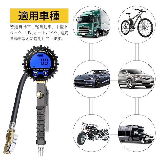 4.【タイヤ空気圧ガンの対応車種】:エアチャックガンは幅広い測定範囲に対応するように設計されており、SUV、オートバイ、トラック、バス、国産車、輸入車、自転車等に対応。
