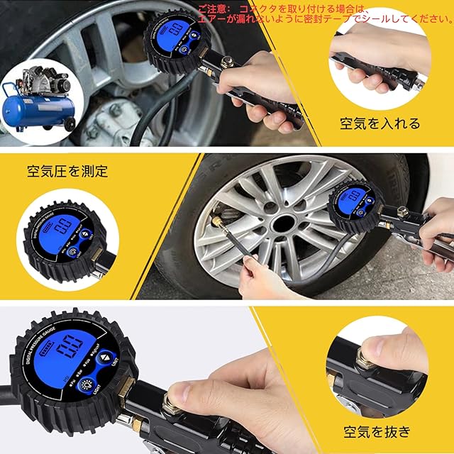 レンジ:3-200PSI 3-1400Kpa 3-14Bar 3-14Kgf/cm² 精度:±1% 最小単位:0.1(PSI) バルブ:米式バルブ チャック形状:押し付け式 ディスプレイ:バックライト付きLCD 測定単位:PSI,Kpa,Bar,Kgf/cm² 互換性:NPTエアコンプレッサコネクタ