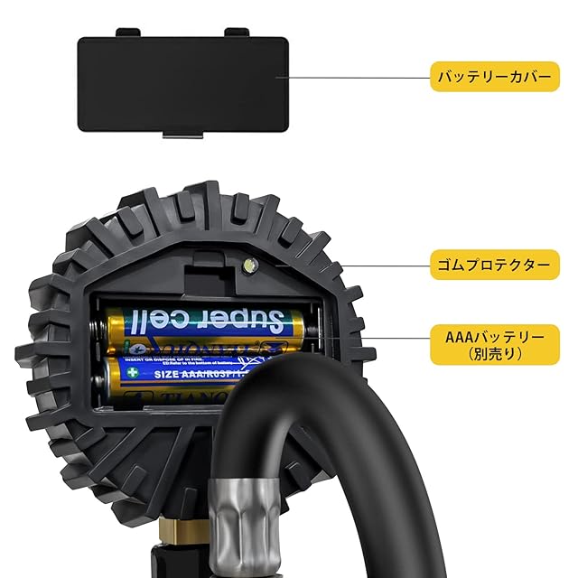 【別途準備物】・単四電池二本を別途用意する必要があります。 ・エアコンプレッサーを別途用意する必要があります。 ・本製品は米式バルブにのみ対応しており、仏式・英式を別途用意する必要があります。