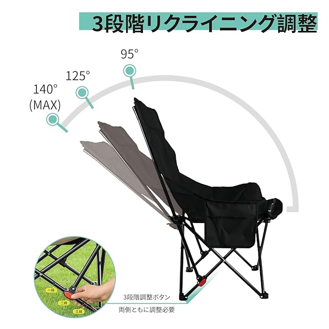 【3段階調整】 背もたれは最大140°までのリクライニングできる3段階調整機能があり、自分の体勢に合わせて楽しめるキャンプ イス。