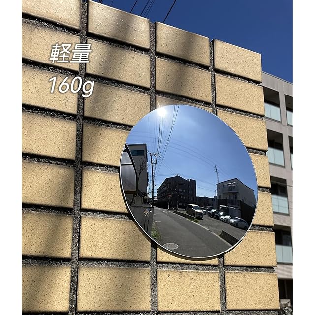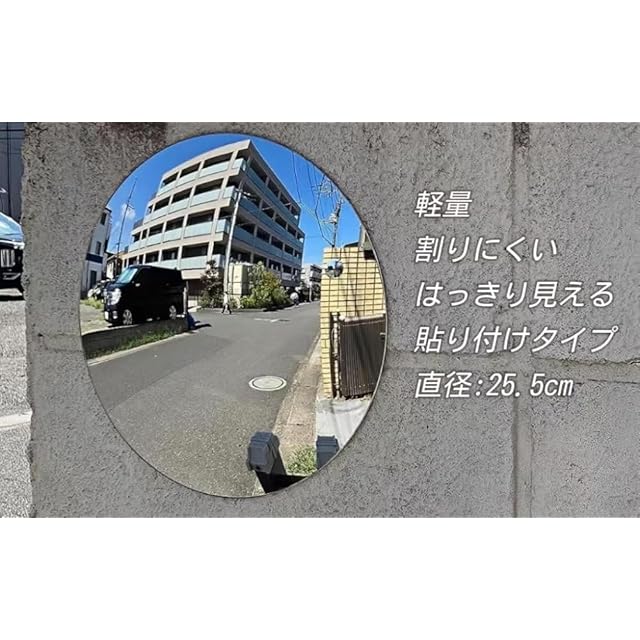 アクリルで作られたカーブミラーで、割れにくくて超軽量。裏面には強力両面テープが貼付け済みなので、テープを外すだけで、取り付けられます。手間がかからない。そして、最大の厚さは3ミリだけで、どこに貼っても邪魔にならない。用途もいろいろあります。ガレージミラーとして、車が出る時の安全確認に!室内のカーブミラーとして、店舗内での万引き防止に! 屋外のカーブミラーとして、エレベーター、入り口などでの防犯に!