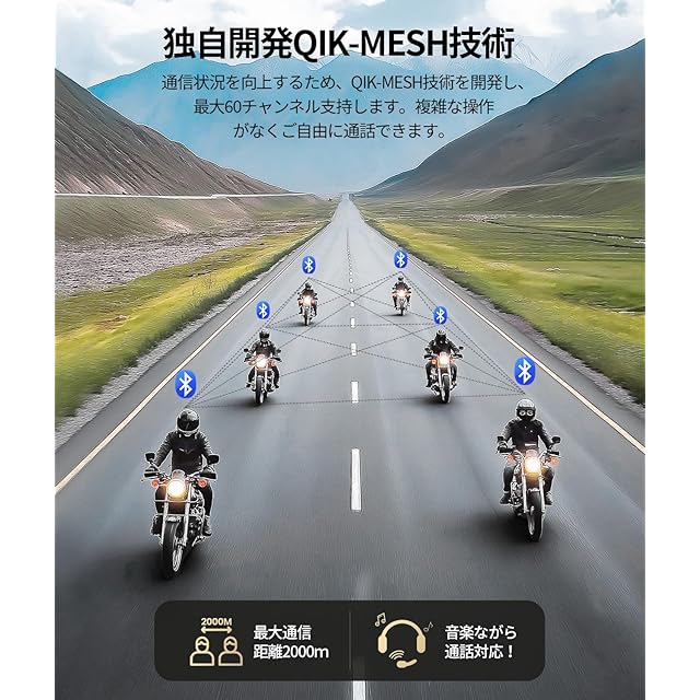 ✅【独自開発次世代QIK-MESH接続技術・通話安定性が大幅に向上】バイクインカムの2台以上接続の通話が不安定を改善するため、JESIMAIK開発部が昼夜を分かたず、独自開発のQIK-MESH接続技術が日の目を見ました。バイク用インカムX6Sは高速移動や遠距離の空間でも、従来品より「音飛び」や「音切れ」」などの状況を大幅に改善できます。最大6人同時通話でき、R16より障害物の信号干渉に強く、前後位置が乱れても通話安定性が下がらなく、いつでも最高の性能でクリアな通話を楽しめます。メッシュ接続は最大60通話チャンネルを選択でき、ペアリング不要、アプリ不要、全部機能が本体で操作でき、チャンネルに入って通話が開始します。Qualcommデュアルチップ5.1採用、超低消費電力を実現し、最大通話距離2000m、自動通信回復、自動着信設定なども備え、ライダー同士と快適にバイクツーリングを楽しめます。(※周囲の障害物や電波環境により、通信距離、通話品質は変動するのでご注意ください。お互いに長距離の場合、番号の順位で走行するのはおすすめです)