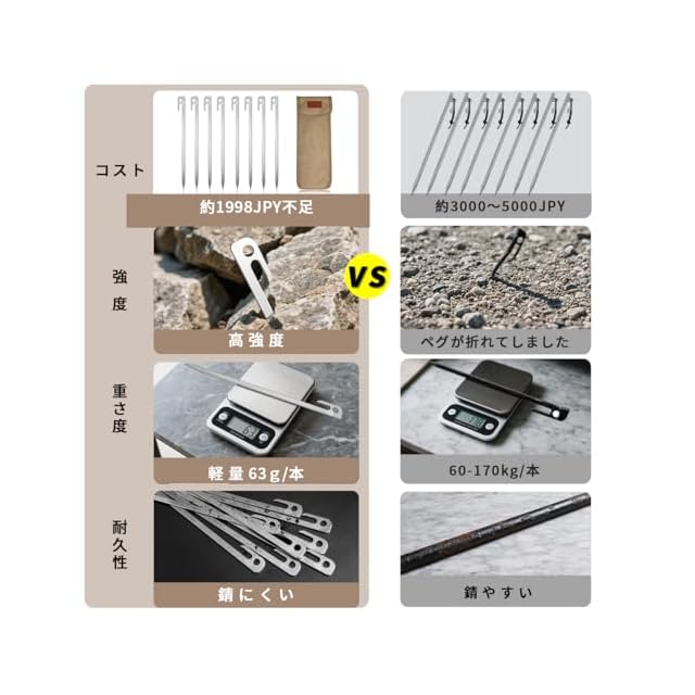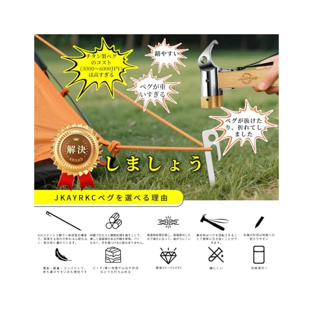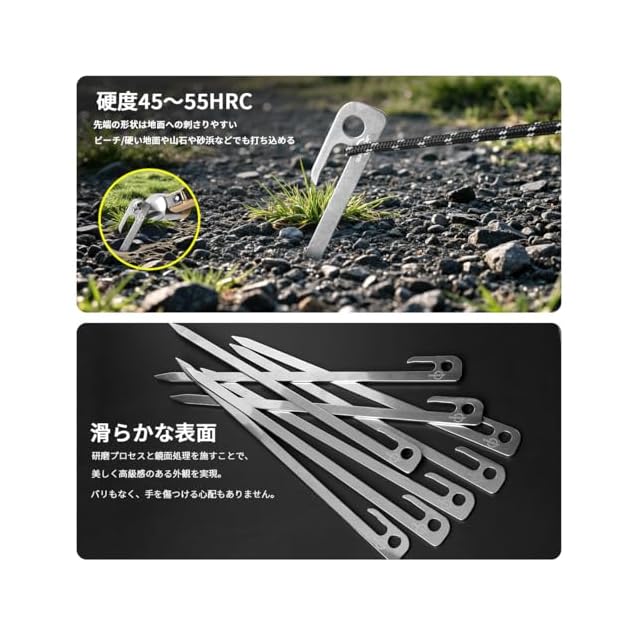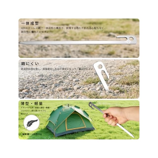 【一体成型の特徴】420ステンレス鋼を一体成型し、高温熱処理加工を施しています。硬度は45~55HRCで、脱落や折れの心配がなく、耐久性に優れ、変形しにくいため長持ちします。さらに、キャンプペグは高温熱処理で高強度化されており、頑丈で曲がりにくいです。