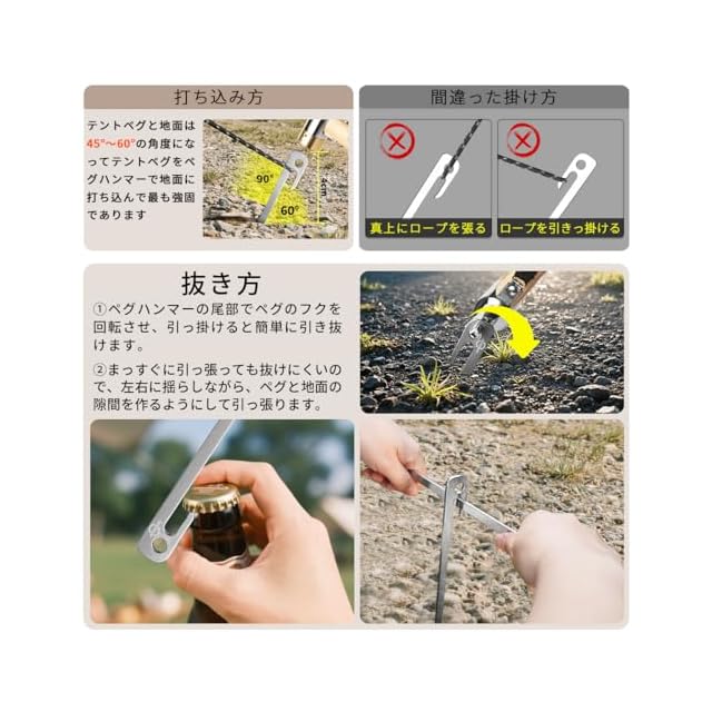 【様々なシーンに対応】山地、草地、土、砂利、芝生、柔らかい地面など、あらゆる場所で使用可能。テントペグは、登山、ハイキング、キャンプに欠かせないアイテムです。強風にも耐える安定性で、テントやタープをしっかり固定します。