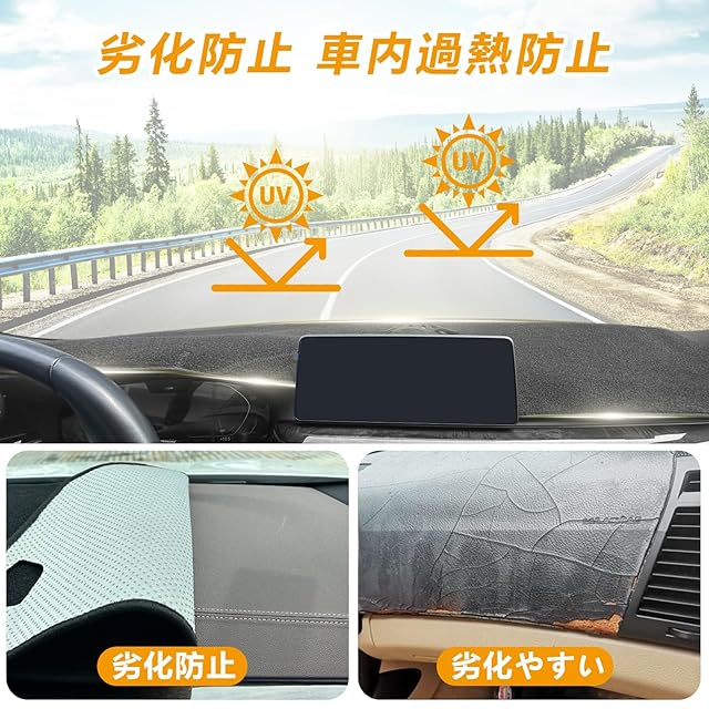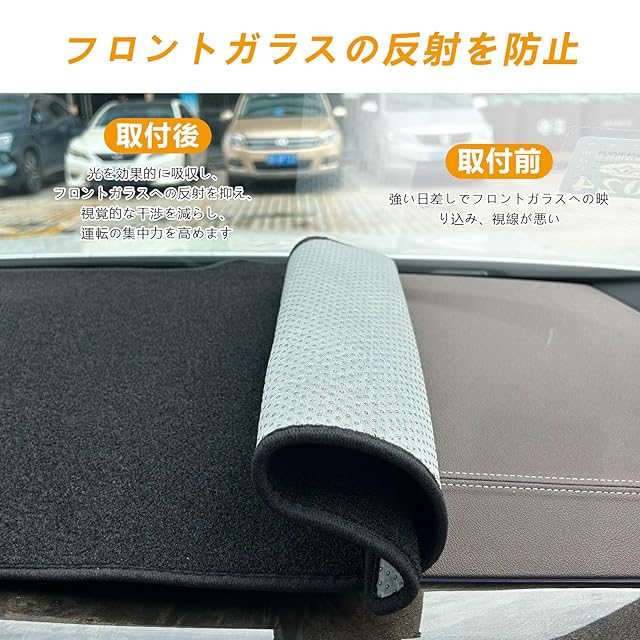 【優れた素材】高品質のポリエステル製です。手触りが良く、通気性があり、無臭である。滑り止め層、断熱層、反射防止層の3層構造、ダッシュボードを完璧に保護。ダッシュボードマットのすべてのエッジは精密に縫われており、耐久性がある。その表面は完全に滑らかではないので、その上に置かれたものは簡単に落ちることはありません。