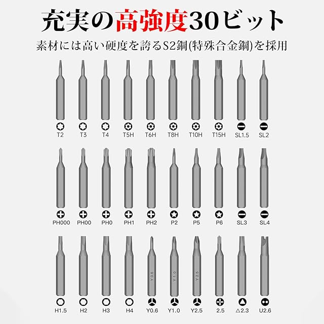 【幅広い使用用途】高硬度S2合金による耐久性に優れた30種類のビットが付属しているため、ご家庭の家電や精密なスマホやゲーム機、自作PCまで、どんな用途でも使用することができます。使用頻度の高いビットを選び抜き、お買い求めやすい 価格となっております。