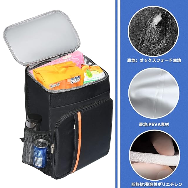 【高品質な素材と保冷性能】生地もしっかりしていて厚手なので、表面は丈夫で傷に強いです。断熱材は厚みがあり、保冷効果は抜群。飲み物などを入れても真夏でも安心して買い出しに行けます。朝から夕方までのほぼ半日保冷でき、日帰りのドライブなどでは問題なく使えます。