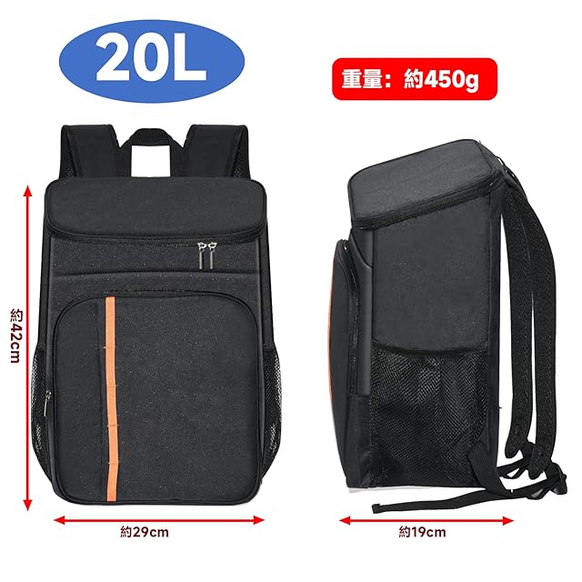 【商品内容】:保冷リュック-本体【素材】:外側:オックスフォード生地、内側:PEVA 【重量】:約0.45kg 【サイズ】: 約29cm×19cm×42cm、折りたたみ時:約42x29x7cm【容量】: 20L 、330mlペットボトル24本収納可能なクーラーボックスです