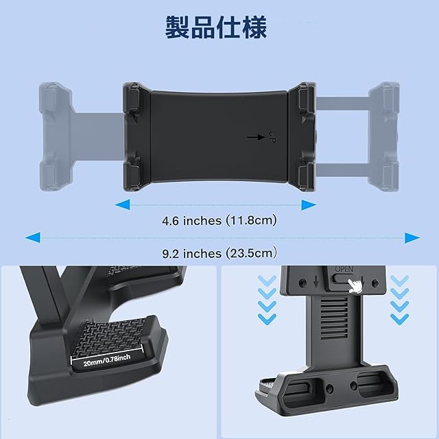 【ユニークなアーム設計】アーム両端の接続部はボールジョイント設計を採用しているため、アームもタブレットを挟む部分も360°回転できます。(アームの長さは9.4CM)視野に邪魔しない角度を調整できます。運転中の安定性を向上!