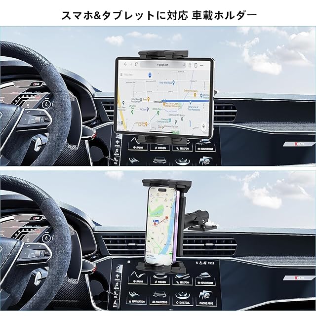 【幅広い互換性】最新型のビス止めタブレット車載ホルダーは5-13インチのスマートフォンやタブレットに対応できます。お客様の意見で、「挟み込みが下に可動しているため固定がしにくい」「取り付けがワンタッチではないため若干面倒」という声に耳を傾け、タブレットを挟む部分はより便利な操作性と幅広い互換性を備えたバネタイプにアップグレードしました。iPhone 16/15/14/13/12/11シリーズ、Sam-sung galaxy、So-ny、Huaweiなどのスマホ、またはiPad、Fire HD 8、Galaxy tabなどのタブレットに対応しています。