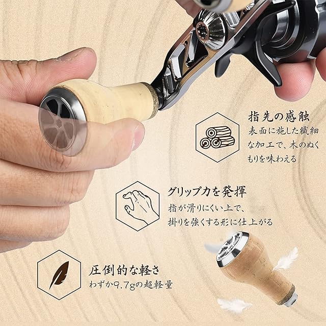 【27mm·コルク製ハンドルノブ】水に濡れても指が滑りにくく、真冬でもお手が冷たくない、使い心地よいです。速く回転させ、ルアーをアクションさせるリーリングジャークがとてもやりやすくなります。参考対象魚:バス(ビッグベイト、クランクベイト)・タイラバ・ロックフィッシュ・シーバスなど。