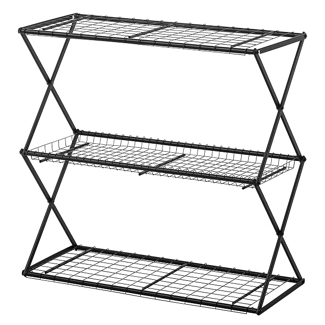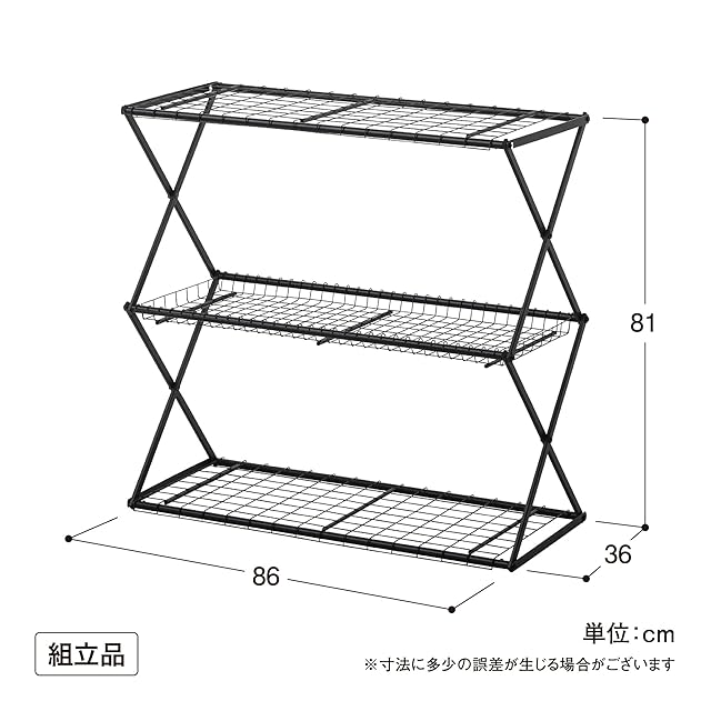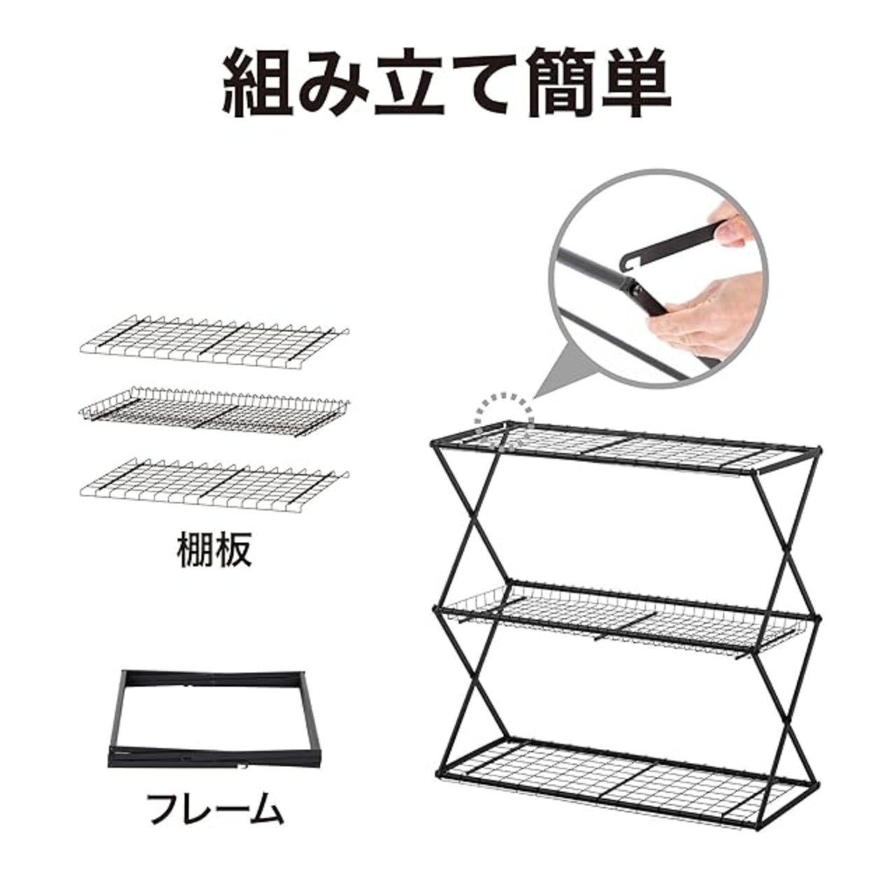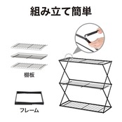 組み立て簡単で、伸ばして広げ、棚板を置けばもう完成。誰でも簡単に設置できる折りたたみタイプで組み立てに工具は使いません。