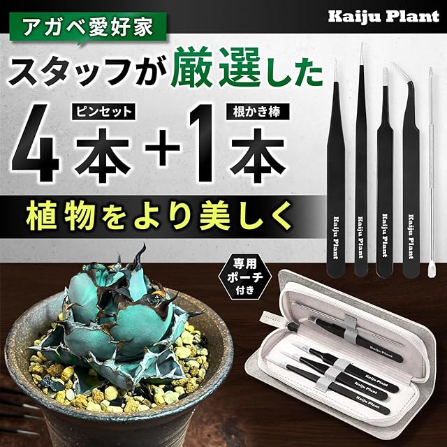 商品名:Kaiju Plant ピンセット 4種 + 根かき棒 植替え 美しく仕上げる 多肉 アガベ サボテン 園芸 DIY ポーチ付き ステンレス