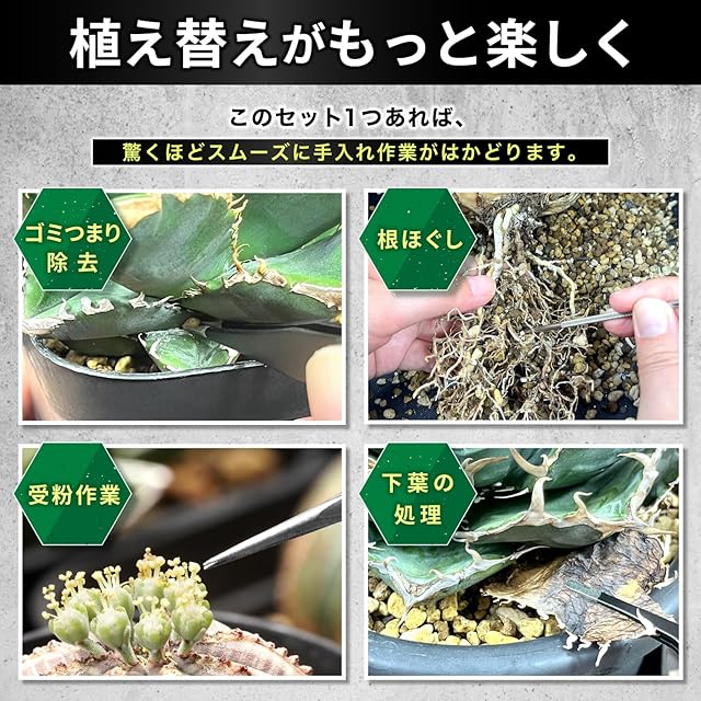 ✅【より美しく】多肉・アガベ・サボテンの植え込みに必要なピンセット4種と根かき棒をセットにしました。植え込み時に植物をより美しく仕立てることができます。さらに専用収納ケース付きで使用後も整理に困ることがありません。