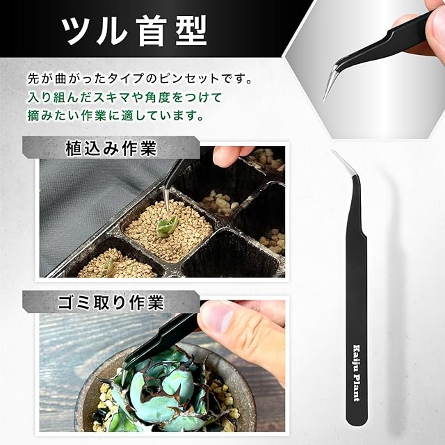 ✅【ツル首型】先の曲がったタイプのピンセットです。入り組んだスキマや角度をつけて摘みたい作業に適しています。【根かき棒】植え替え時の根を崩す作業、根の間に砂を詰める作業に最適です。先端は尖りを落としてあるため植物にやさしく、逆端はスパチュラ形状になっており、土を掘ったり均したりする作業にも使えます。