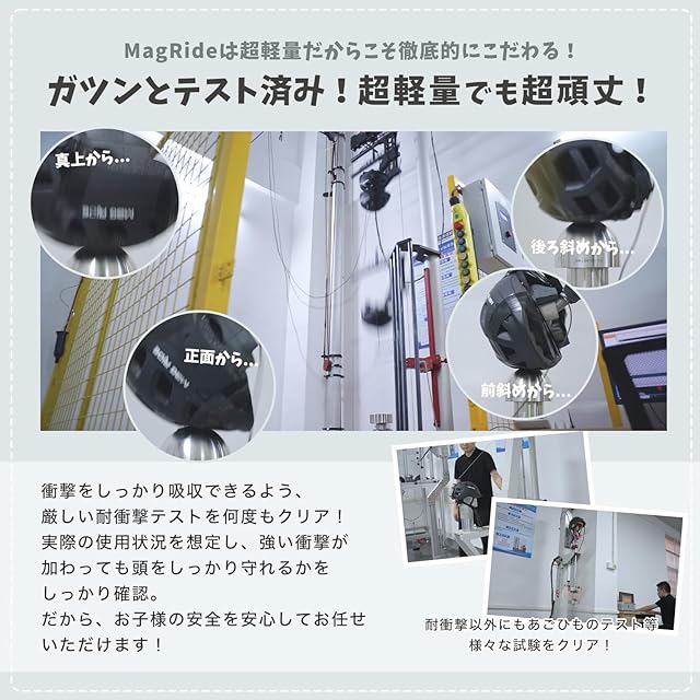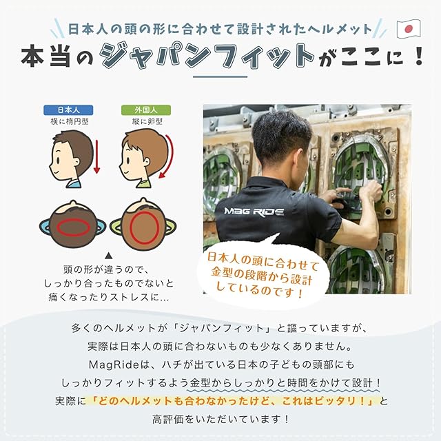 【MagRideは全て"日本人専用"設計】 日本人と外国人の頭の形は異なります。巷のほとんどのヘルメットは海外規格のためフィット感がイマイチな場合も・・・。Mag Ride シリーズは日本人の頭部の形状に合わせた専用設計のため頭にピッタリとフィット!着用時のズレなどでお子さまが嫌がることなく被ってくれます。※フィット感には個人差があります。