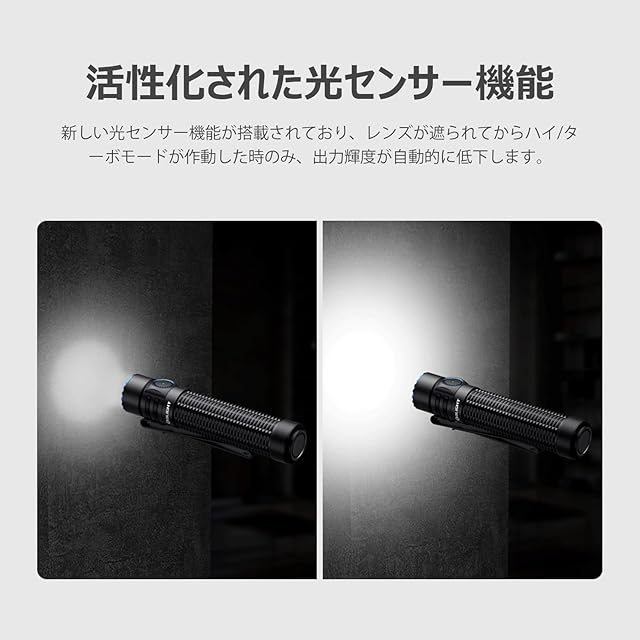 光センサー機能搭載:光センサー機能が内蔵されており、レンズが遮断されて誤ってハイ/ターボモードに入った場合、出力輝度が自動的に低下します。高輝度ギアの使用を損なうことなく、ライトの機能性を確保します